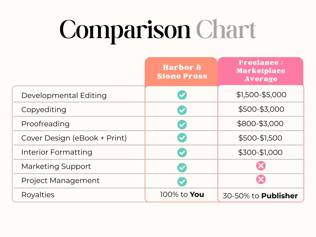 Most people think publishing can be done for $800. But when you add up editing, design, formatting, and marketing, the true cost can be up to $20,000+ for a well-positioned novel. Harbor & Stone gives you everything for one flat fee — and you keep 100% of your royalties.
